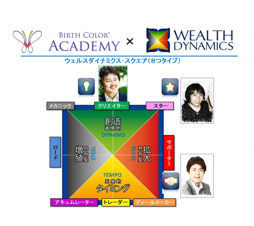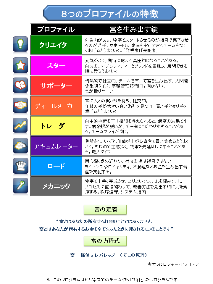 ウェルスダイナミクスとは、プロファイルテストで人間を8つのタイプに分け、自分の強みと弱みを明確にし、誰と組む(レバレッジをかける)とよい結果をもたらすかを説く実践的なプログラムです。